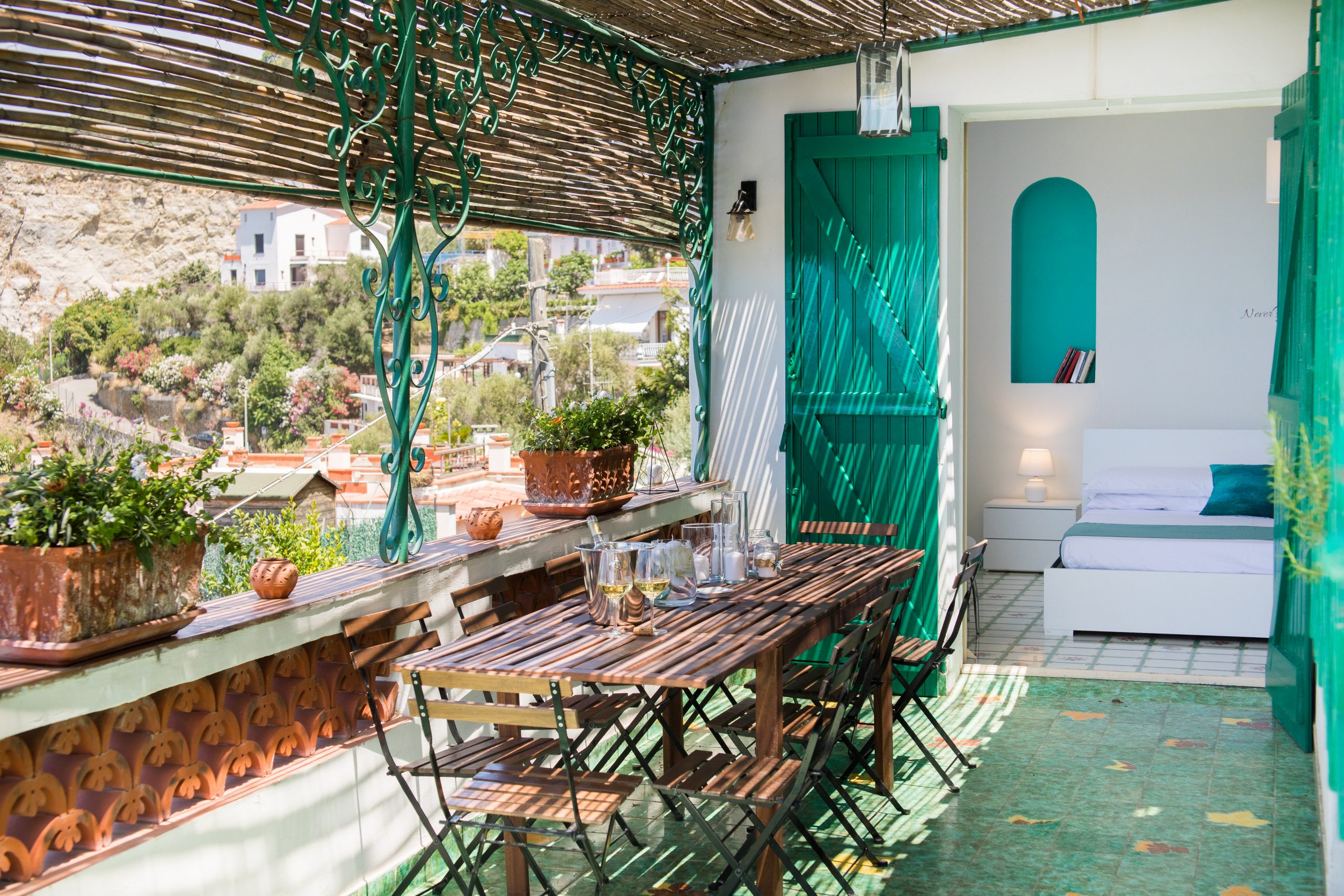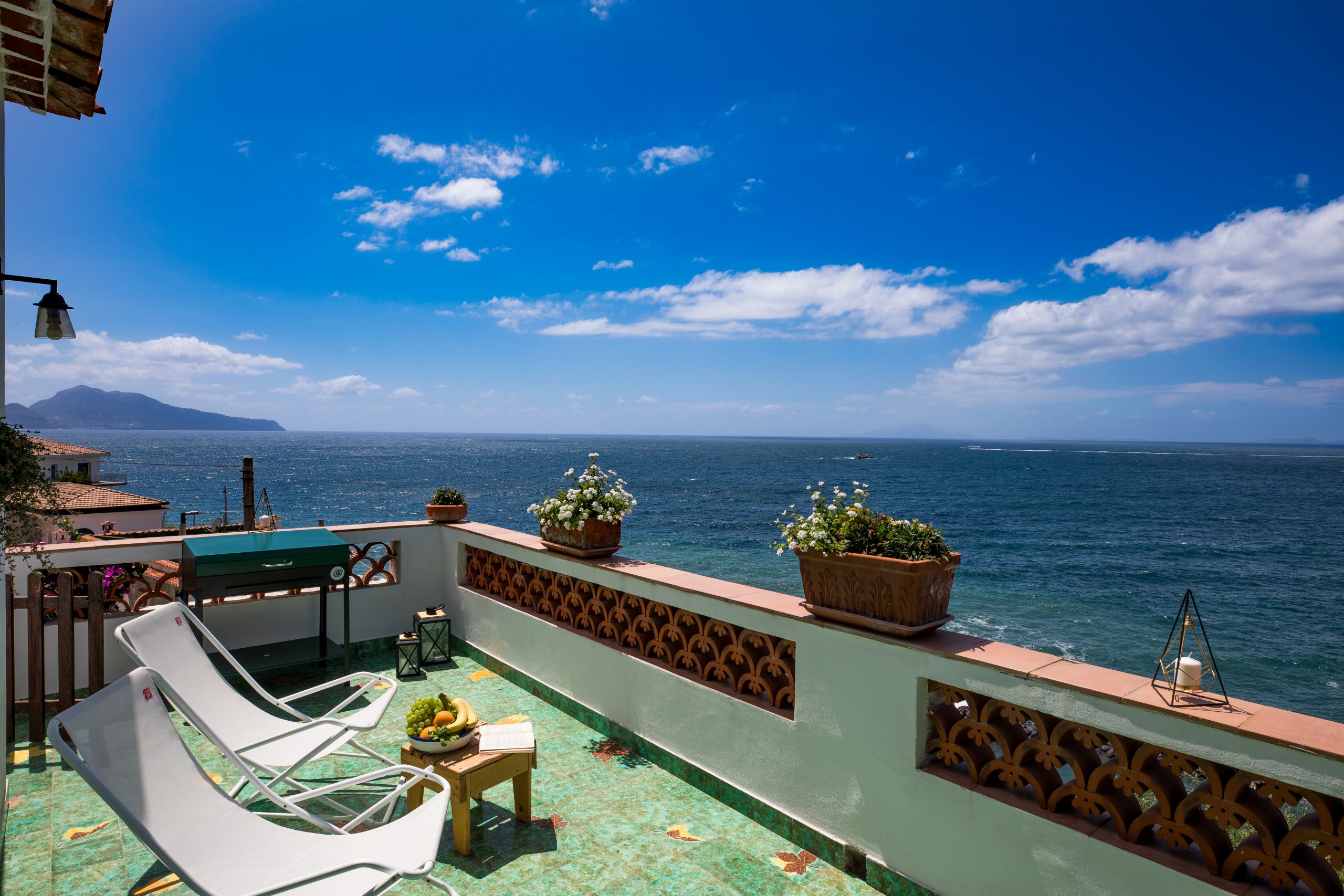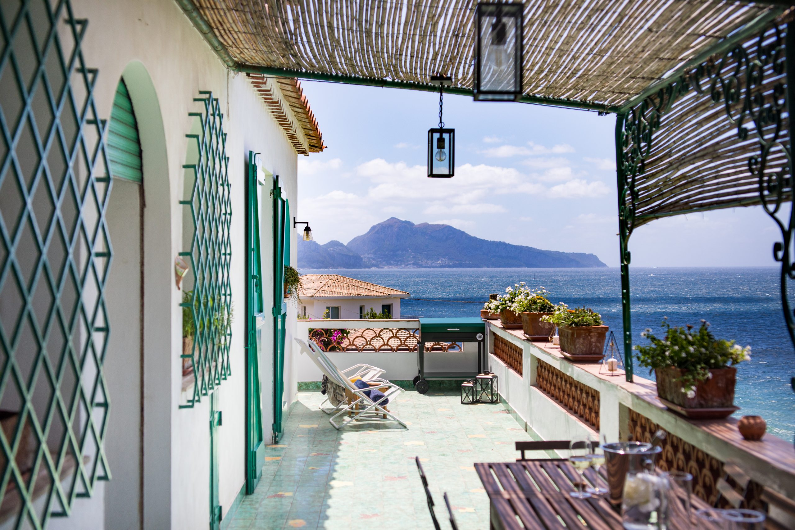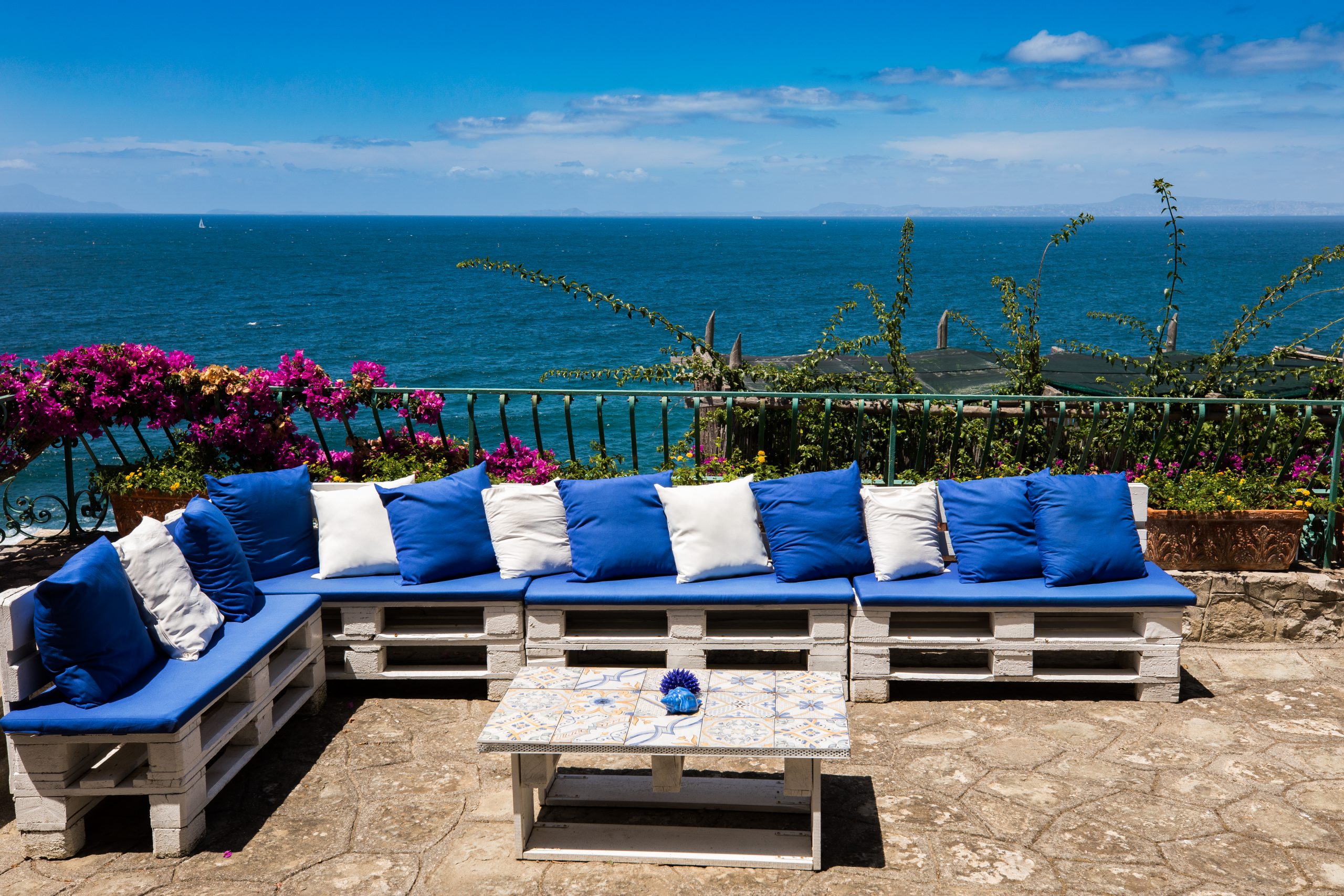 The villa is surrounded by a number terraces, two of which are communal and are fully equipped with the right comforts to relax with a superb view. There is a nice terrace behind the villa surrounded by Mediterranen plants, lemon trees and palm trees which is equipped with a table with chairs, wooden sunbeds and a swimming pool (open from May to October) to take full advantage of the beautiful sunny days typical of the south of Italy. The highlight of this beautiful costal villa is the Rooftop Solarium on the last floor. A place where to admire the stunning view of the Bay of Naples. This terrace is supplied with tables and chairs to enjoy an aperitif and sunbeds to top up your tan. The terrace is adorned with several Mediterranean palms and offers the most dramatic view over the Bay of Naples and its islands of Capri, Ischia and Procida (Italian Capital of Culture 2022).